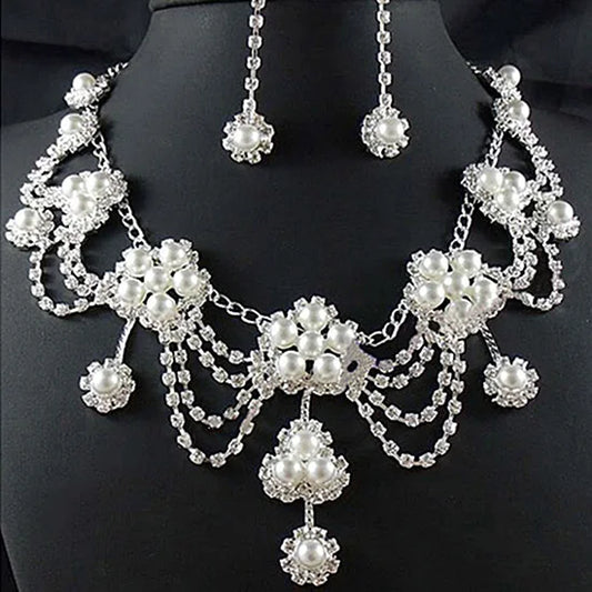 Smyckeset Ingrid (halsband & örhängen med pärlor och strass – bröllopsstil)