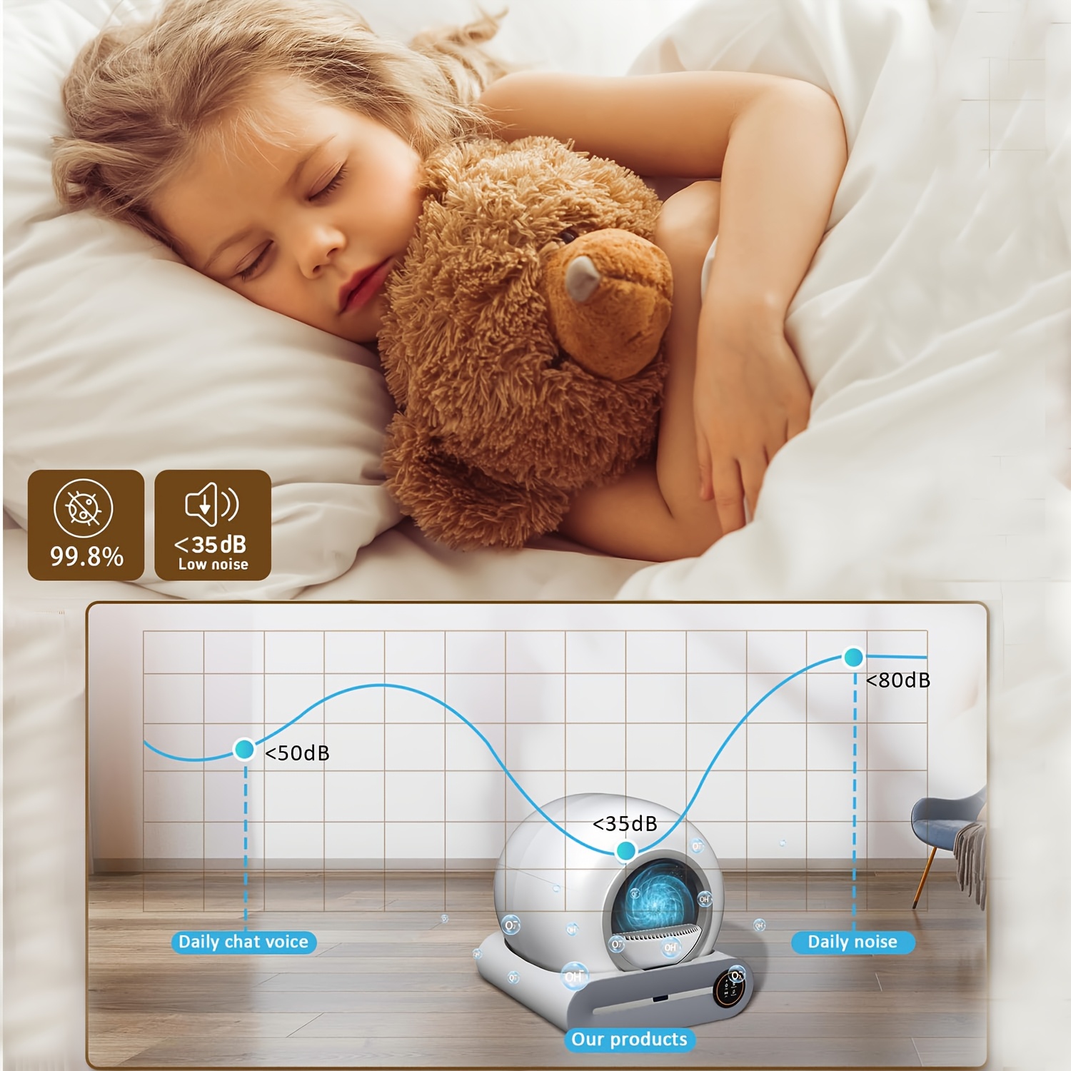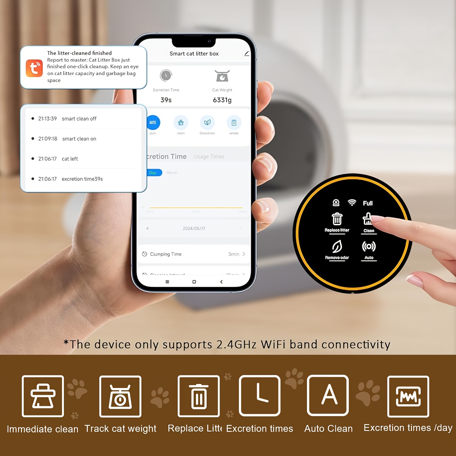 Den smarta, runda designen är utrustad med Wi-Fi-anslutning och automatisk rengöringsfunktion. Efter varje användning separerar den kattströ från avfall och samlar det i en försluten behållare, redo att tömmas när du vill – inte när du måste.