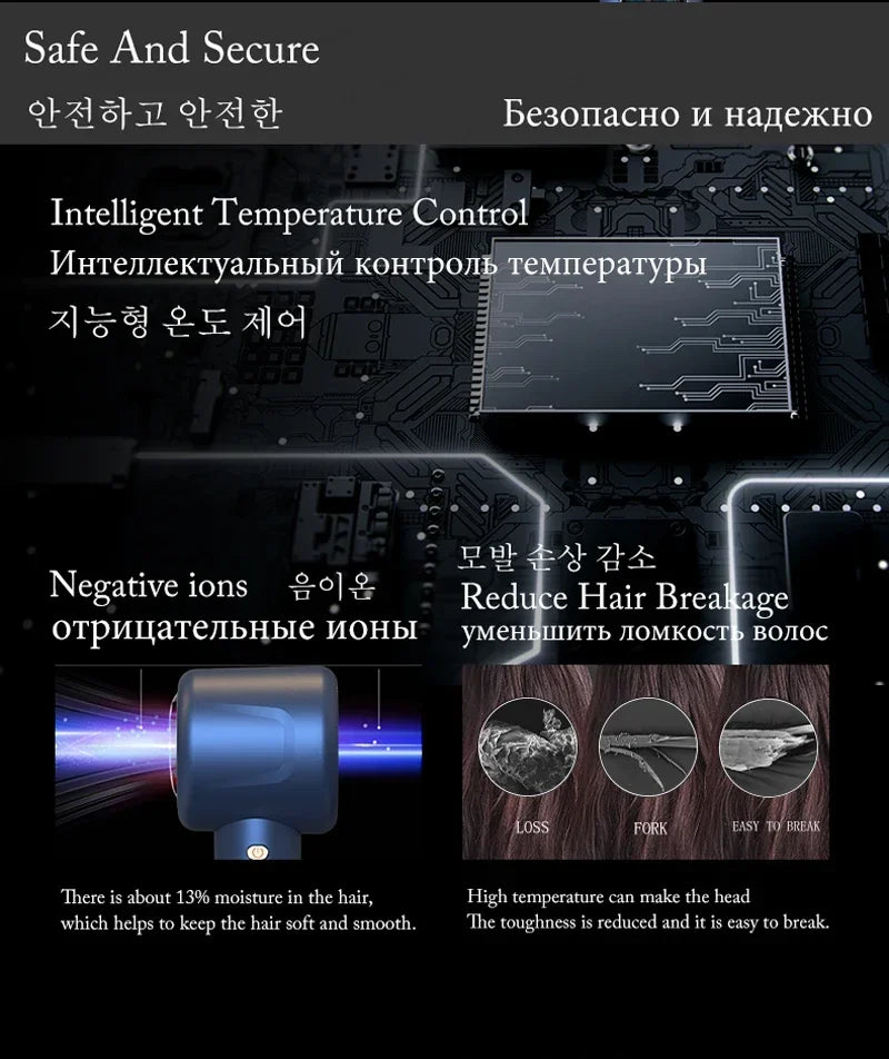 Med en digital motor på hela 110 000 varv per minut och en styrka på 2000W torkar du håret upp till 5,5 gånger snabbare än med en vanlig hårfön. Resultatet? Mindre värmepåverkan, friskare hår och mer tid över för dig.