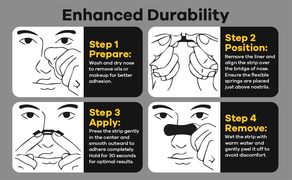 Dessa nässtrips lyfter försiktigt näsborrarna och gör det lättare att andas hela natten. Lätta att använda, diskreta och effektiva. Ett enkelt sätt att minska snarkningar och vakna mer utvilad.