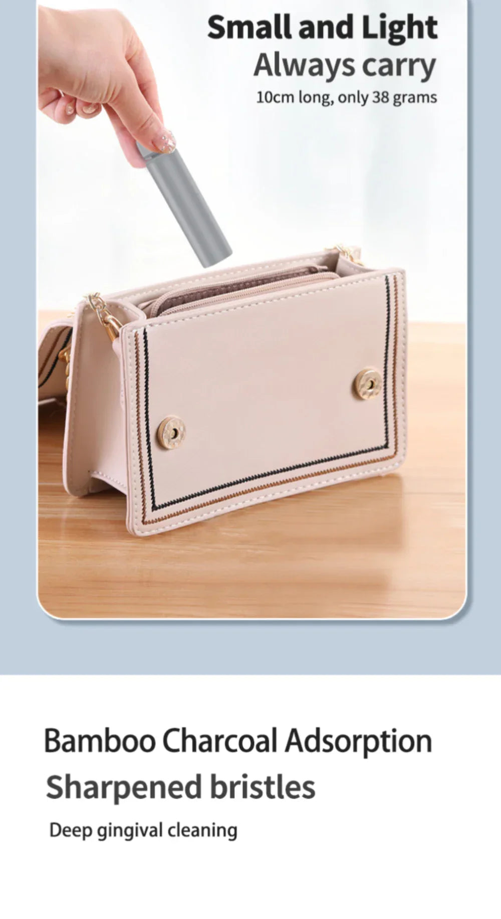 Olitpa sitten matkoilla, töissä tai kokousten välillä , MiniTravelToothbrush™ on täydellinen kumppanisi nopeaan ja helppoon hampaiden harjaukseen missä tahansa. Taittuvan muotoilun ansiosta sitä on helppo säilyttää taskussa, käsilaukussa tai meikkilaukussa – ilman, että harja likaantuu.