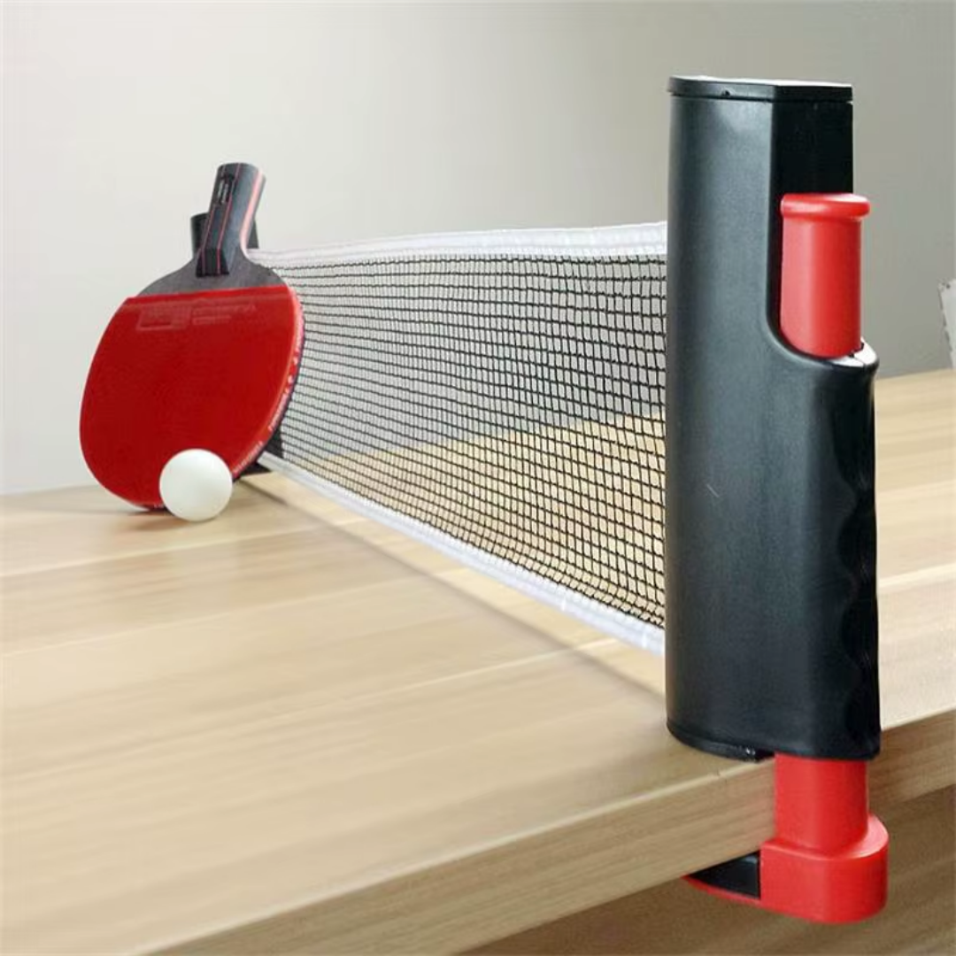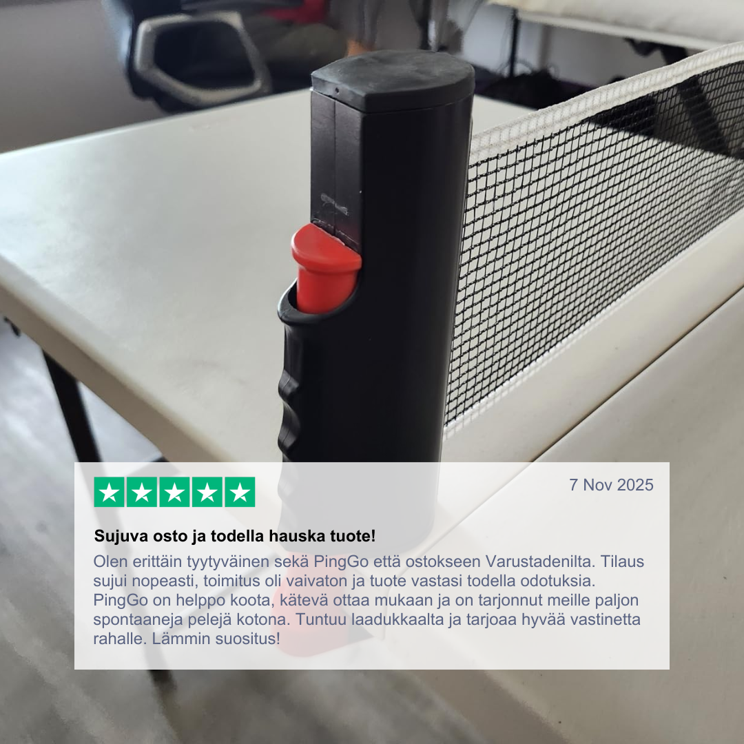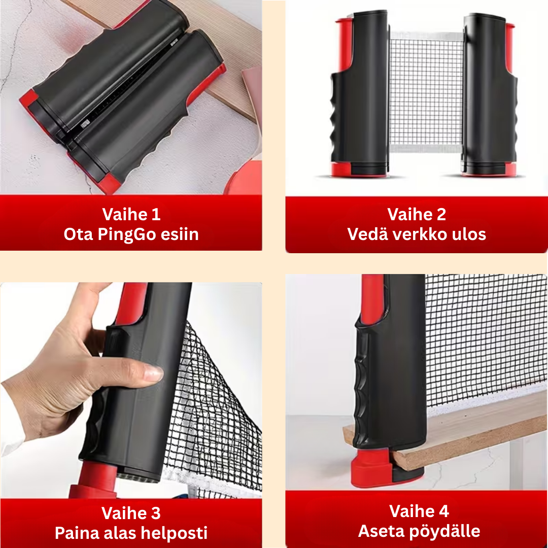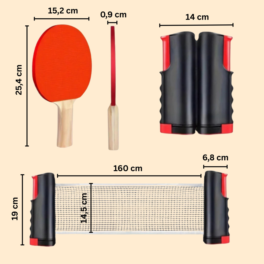Verkko kiinnittyy suoraan pöydän reunoihin ja vedetään ulos sekunneissa. Tavallinen pöytä muuttuu nopeasti pingispöydäksi – keittiössä, terassilla tai ulkona. Pelin jälkeen verkko on helppo irrottaa ja rullata takaisin kokoon.