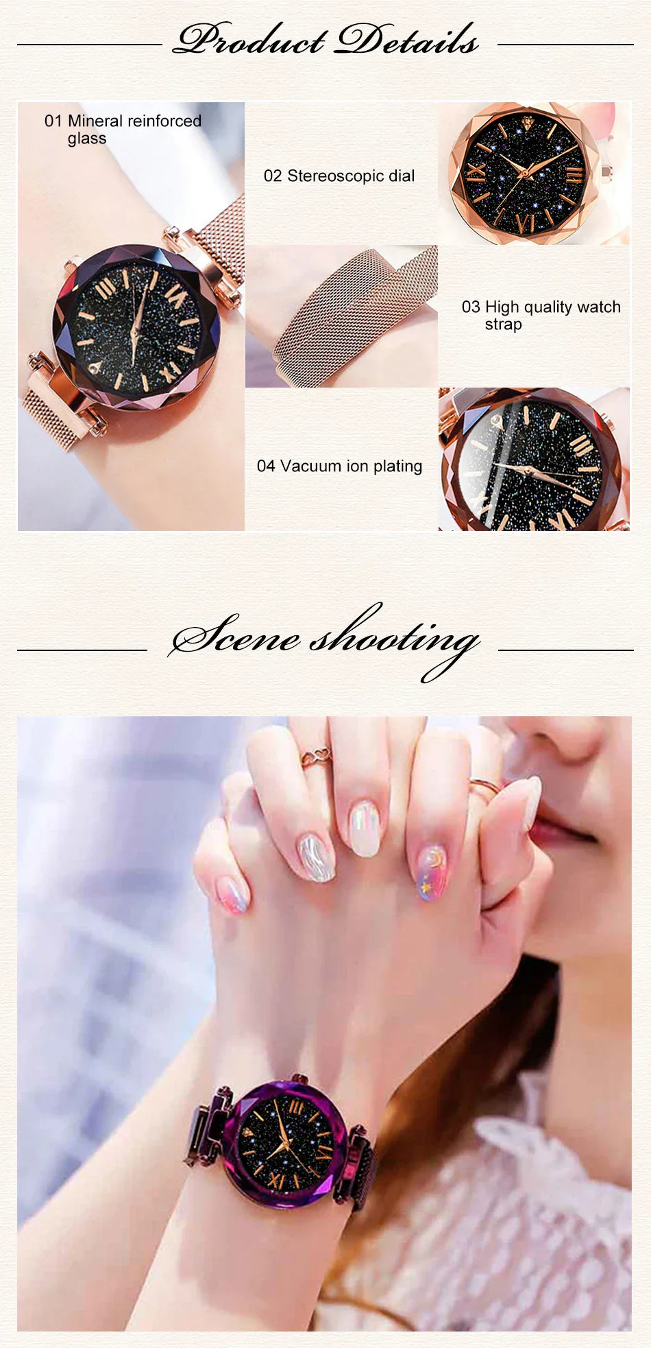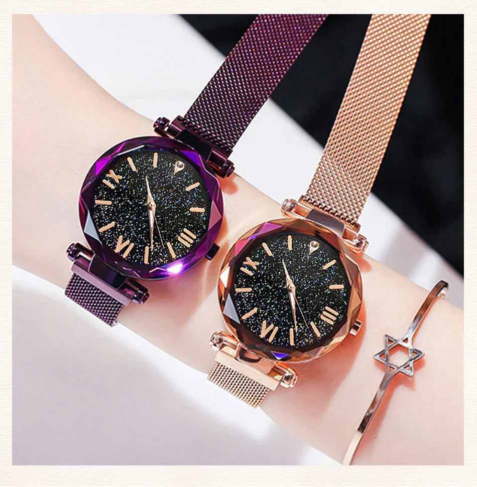 Klocka Stina (stjärnhimmel-design med magnetiskt spänne och meshband)