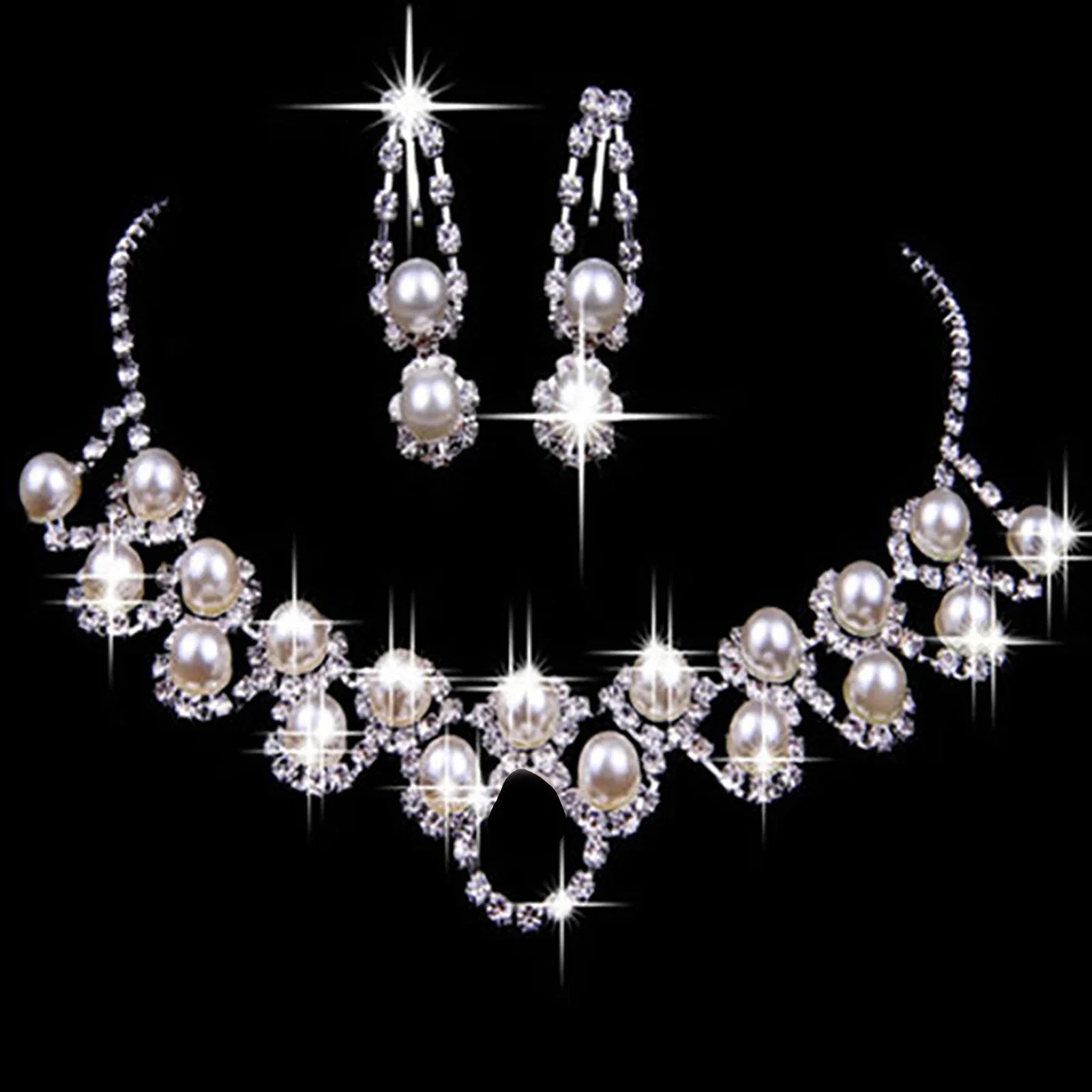 Smyckeset Ingrid (halsband & örhängen med pärlor och strass – bröllopsstil)