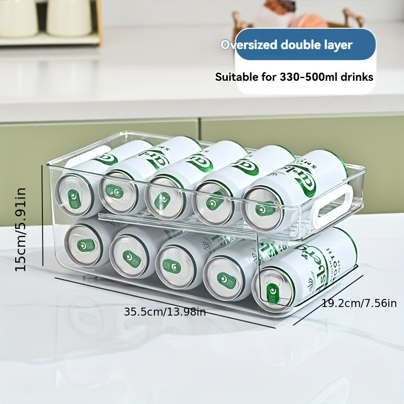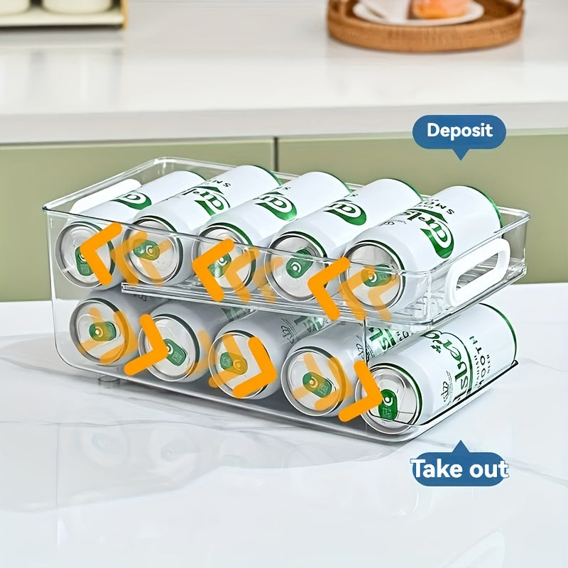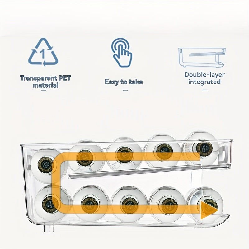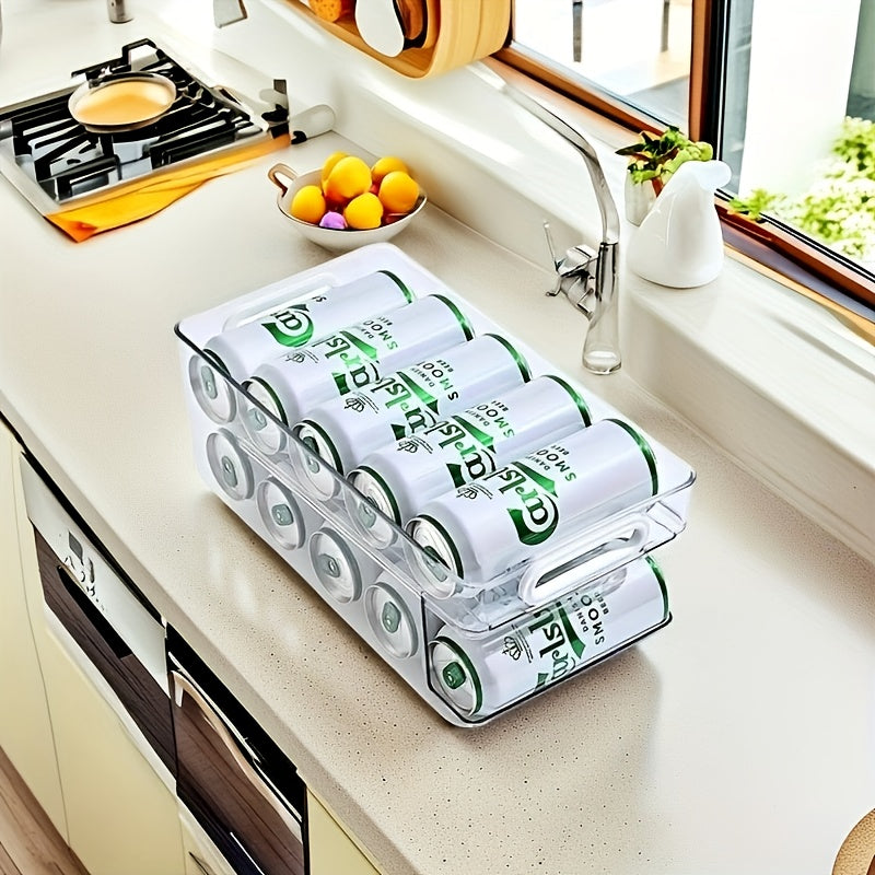 Det tvåvåningsdesignade stället utnyttjar kylskåpsutrymmet maximalt. Placera burkar på båda nivåerna och fyll på uppifrån – de rullar framåt av sig själva så att du alltid tar den äldsta först. Perfekt för läsk, energidrycker, öl eller kolsyrat vatten.