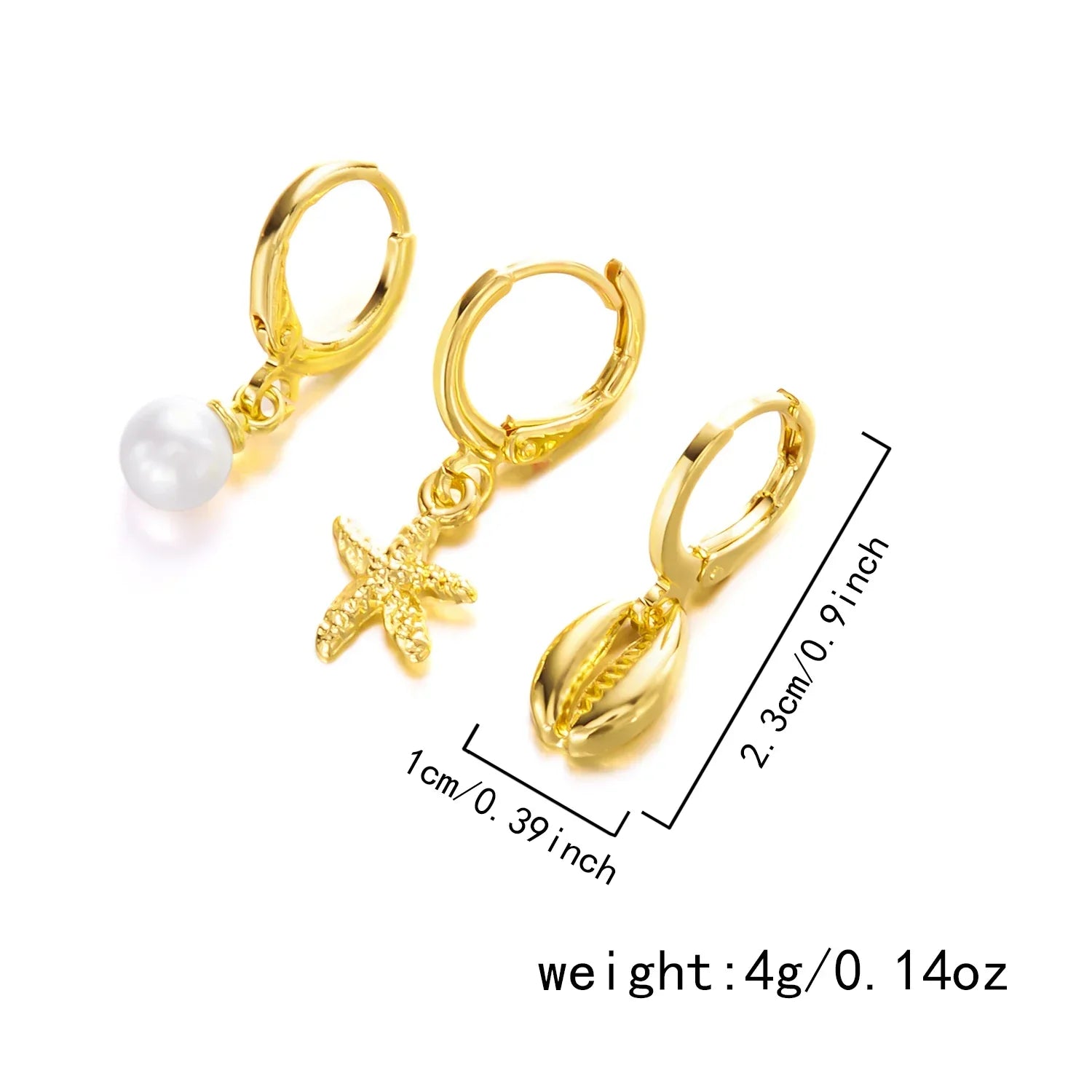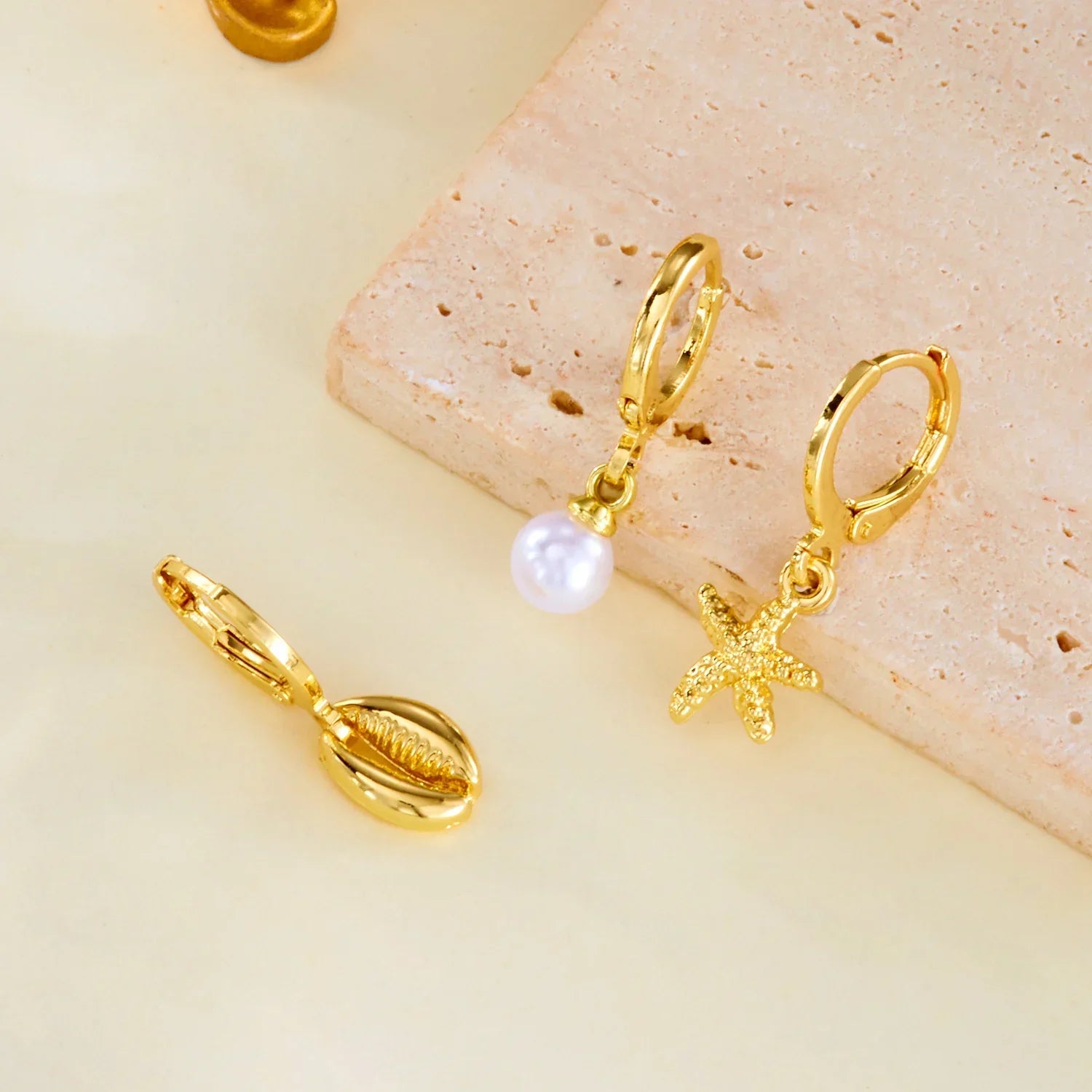 Örhängen Elin (3-pack med snäcka, sjöstjärna & pärlor – boho strandstil)