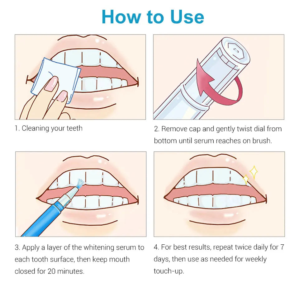 3.Apply a layer of the whitening serum to each tooth surface, then keep mouth closed for 20 minutes.