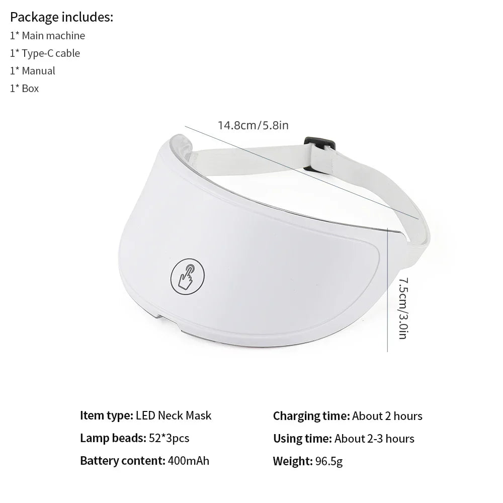 Tillverkad i hudvänligt material, CE-certifierad och utrustad med inbyggt skydd mot överhettning. Masken laddas via USB, har en batteritid på ca 1,5 timmar och levereras komplett med halsdel, manual och skyddande förpackning.