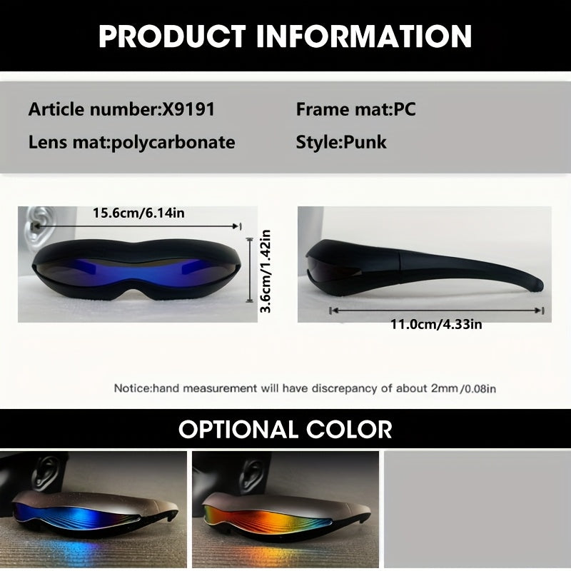 Tillverkade i PC-ram och TAC-linser är glasögonen både lätta och tåliga. Den breda designen gör dem bekväma att bära under hela festivaldagen eller på en lång cosplaykväll.
