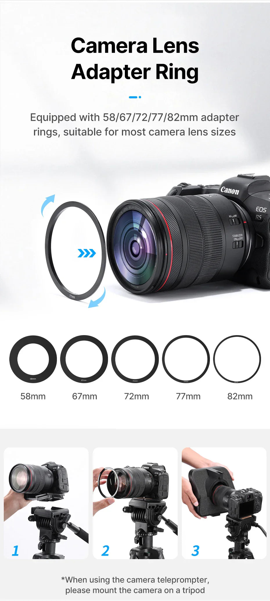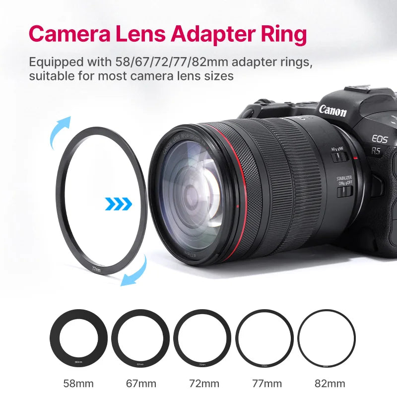 • 5 adapterringar (58mm, 67mm, 72mm, 77mm, 82mm) – enkel montering på olika objektiv.
