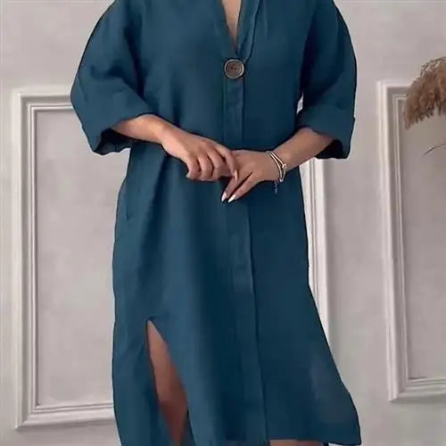 Denna skjortklänning i mjuk bomull och linne är den perfekta kombinationen. Med sin enkla design, knappar framtill och luftiga tyg får du en klänning som känns naturlig och tidlös. Den funkar lika bra till vardags som till en avslappnad middag. Du får ett plagg du alltid kan lita på.